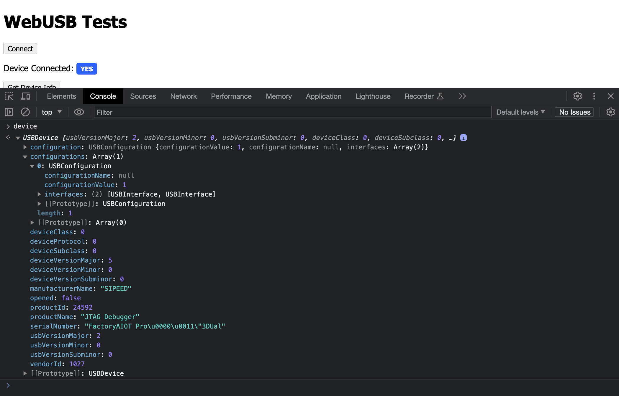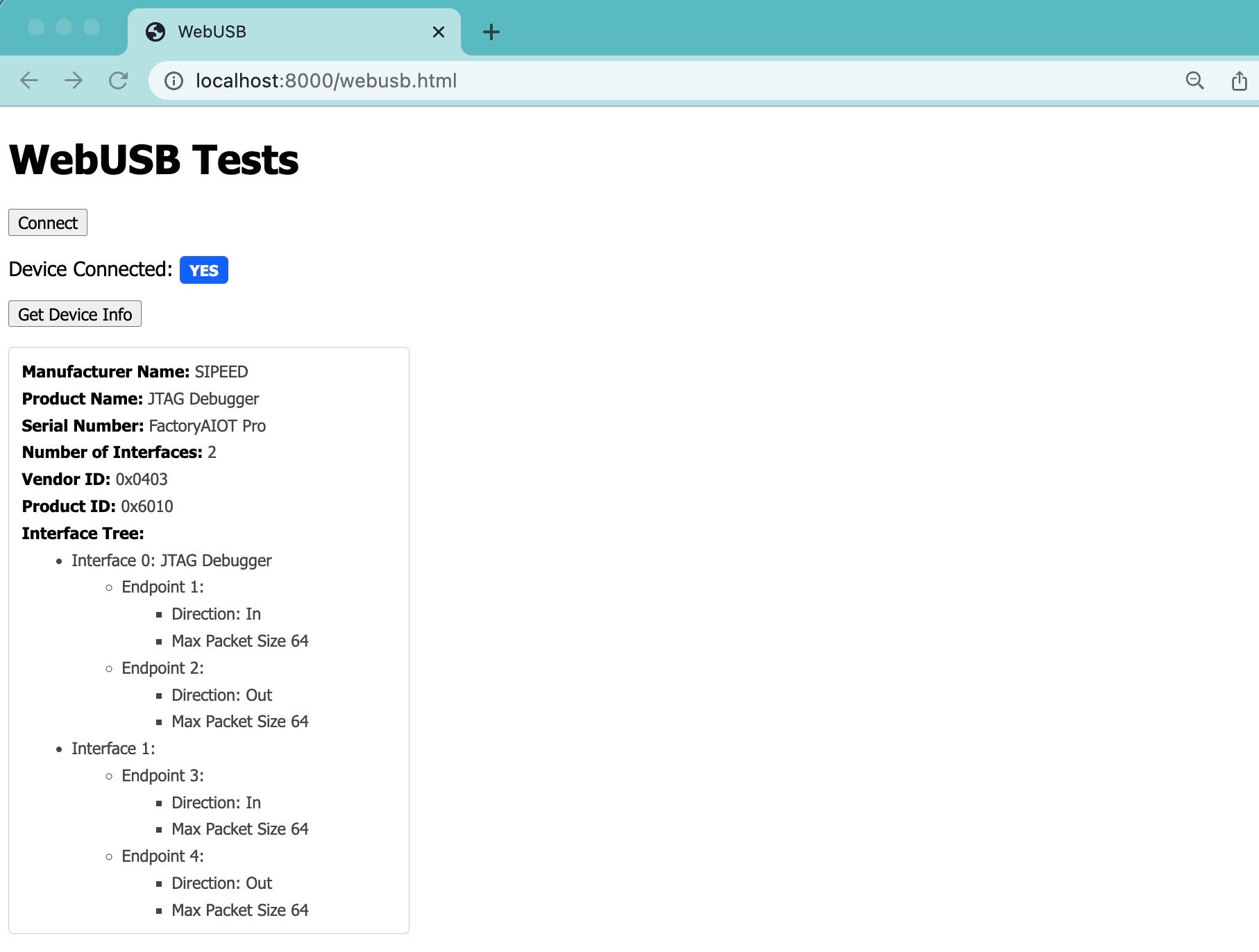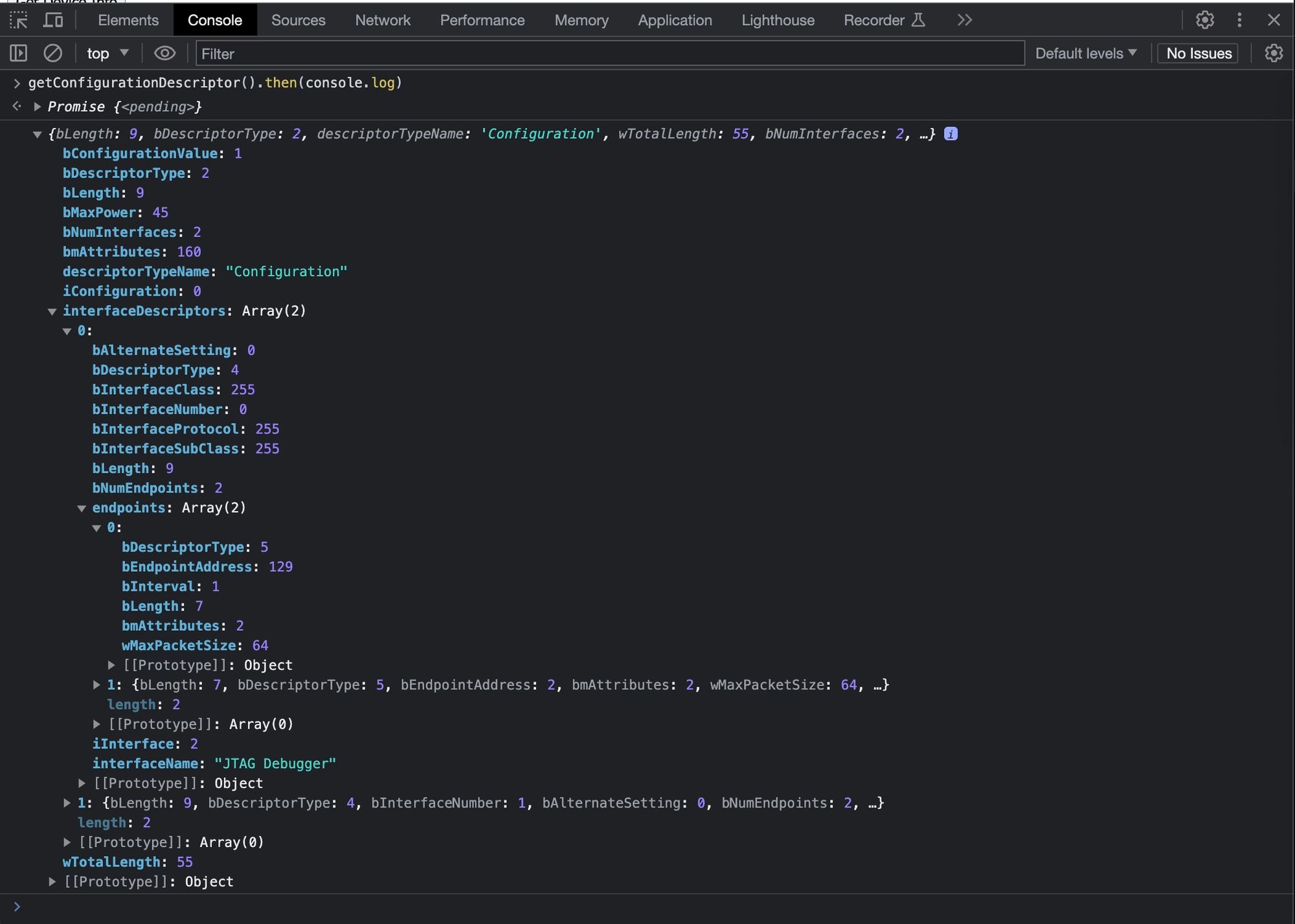}This function will accept an array of bytes to send, it will send that data over endpoint 2. As we saw from debugging WebUSB the first interface is the JTAG interface and it has two endpoints numbered 1 & 2 and 2 is the output endpoint and 1 is an input endpoint.