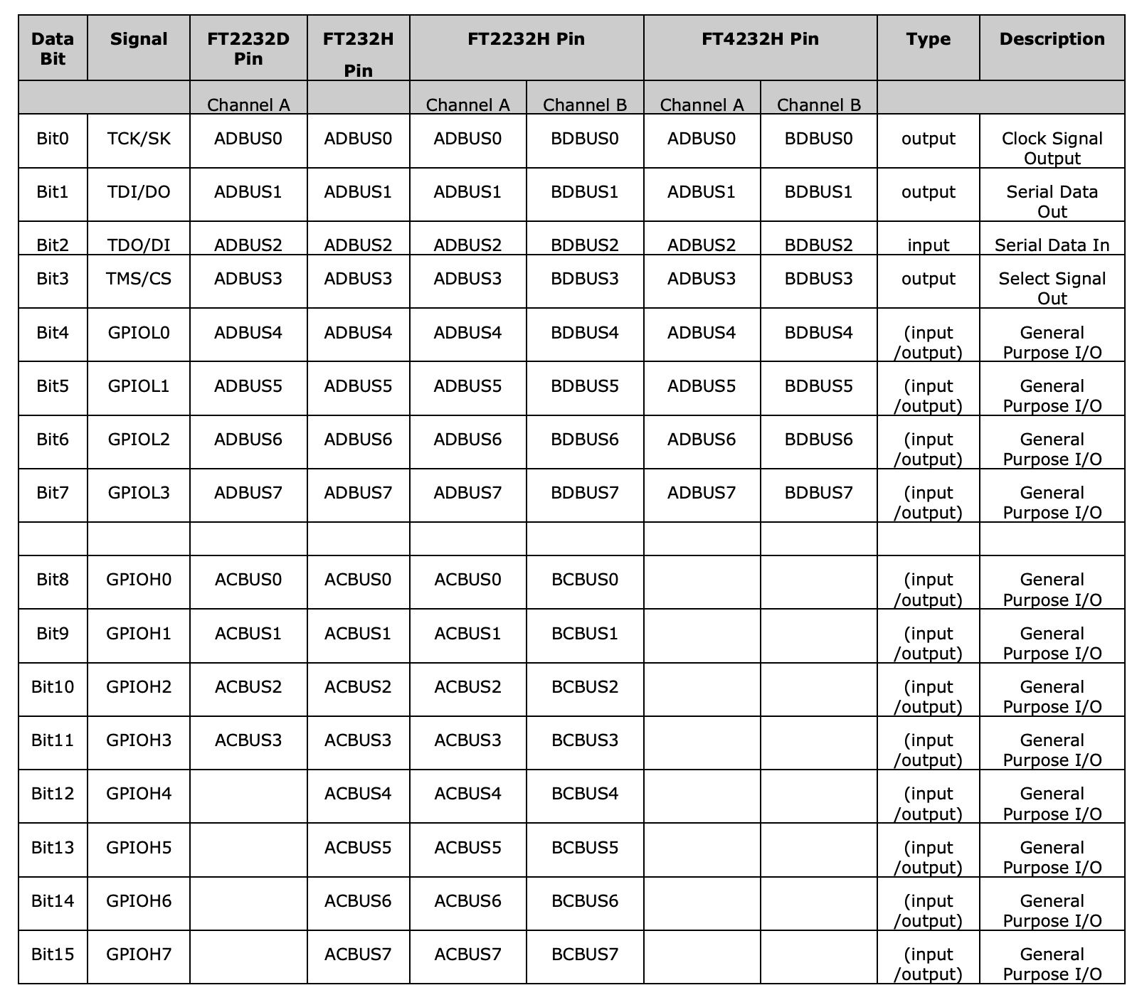 The chip on board is the BL702 using the following firmware to emulate the parts of the FT2232D that are required for JTAG programming. MPSSE is the sub-protocol used by the FTDI to convert a series of actions recieved from the computer into the serial protocol JTAG. What I mean by this is from the computer we can just send the FTDI device an MPSSE command saying "send these 4 bytes over TDI and then read back 2 bytes from TDO" and the FTDI would process this command and then perform these actions serially over the 4 JTAG pins (it's a bit more involved then that as we will see below, but that is the gist).