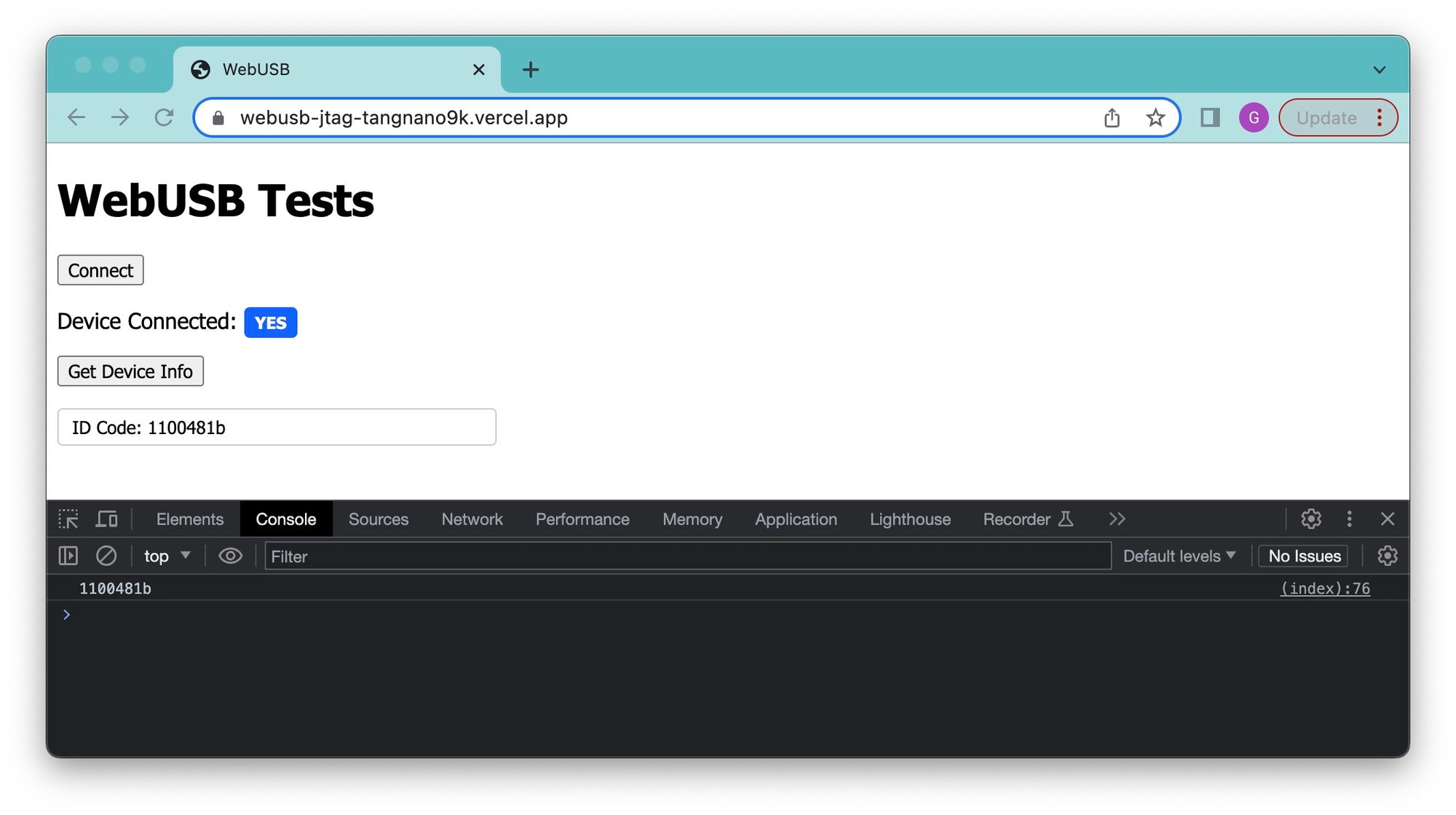 });Reloading the page and pressing on the connect button to connect our FPGA will trigger our code and print the ID code to the terminal and add it to the screen.