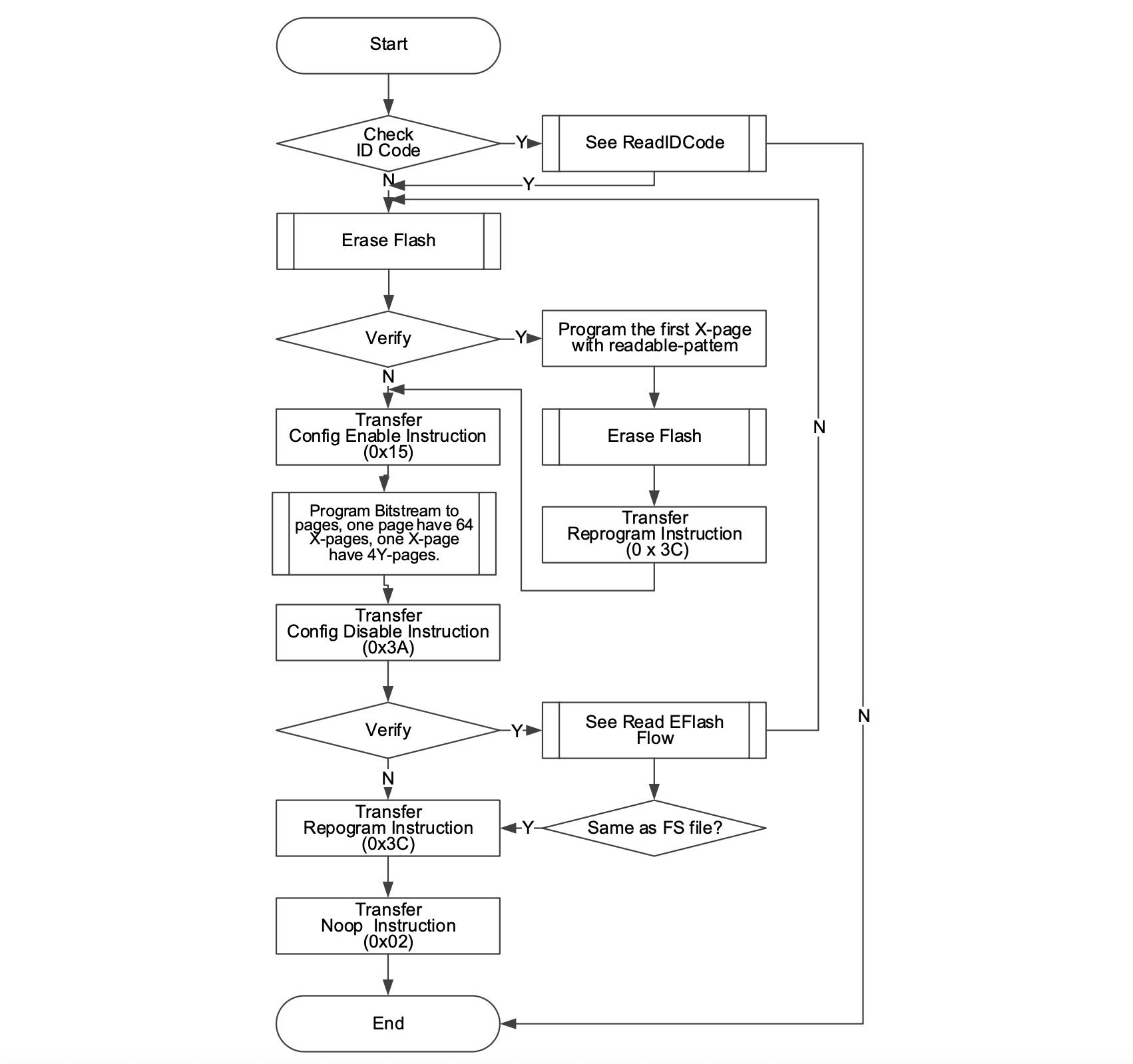 Once done you can disable configuration and then re-read the flash back to verify that it is what you sent. Finally we re-run the "Transfer Reprogram" instruction to load up the flash into SRAM starting your bitstream. The docs also claim you should end with a No-Op instruction at the end to complete the programming procedure, so I will take their word for it.