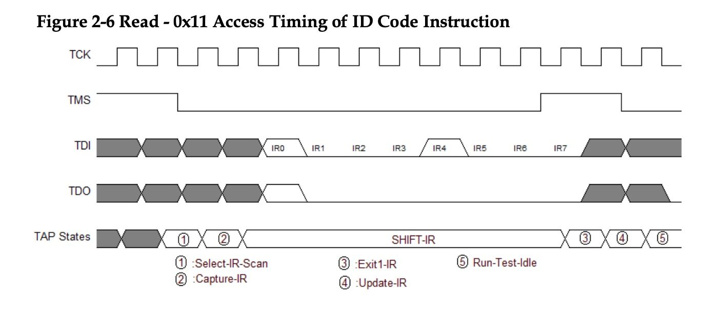 Next we need to send 7 bits over TDI with the instruction to get the ID code of the FPGA (0x11) so following the same strategy for finding the command and parameters we would need to send: [0x1B, 0x06, 0x11].