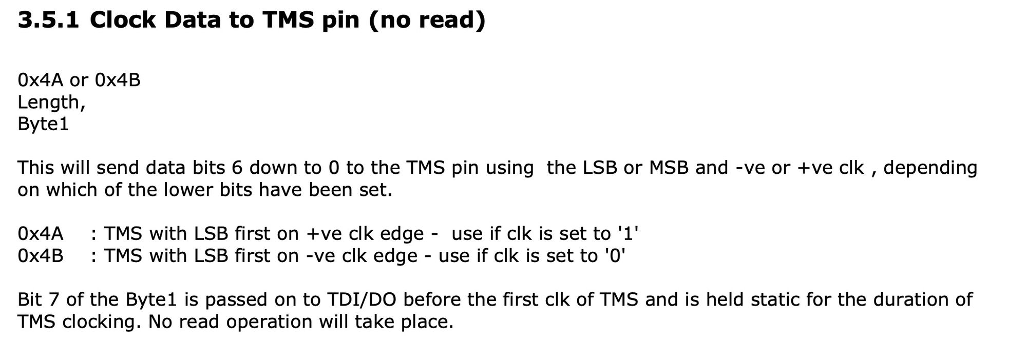 This is exactly what we need when we finish shifting in data, we need to send the last bit and jump to the next TAP state, so using this functionality we can both set TDI and TMS (at least for 1 bit). But we are getting a bit ahead of ourselves, to wrap it up, we want to send 4 bits so we would set length to 3 and we want TMS to be 1 -> 1 -> 0 -> 0 and we are sending the data LSB (and let's say we set TDI to 0) then we would send 0b00000011 (or also 0x03) so that the least significant bit will be the first transition.