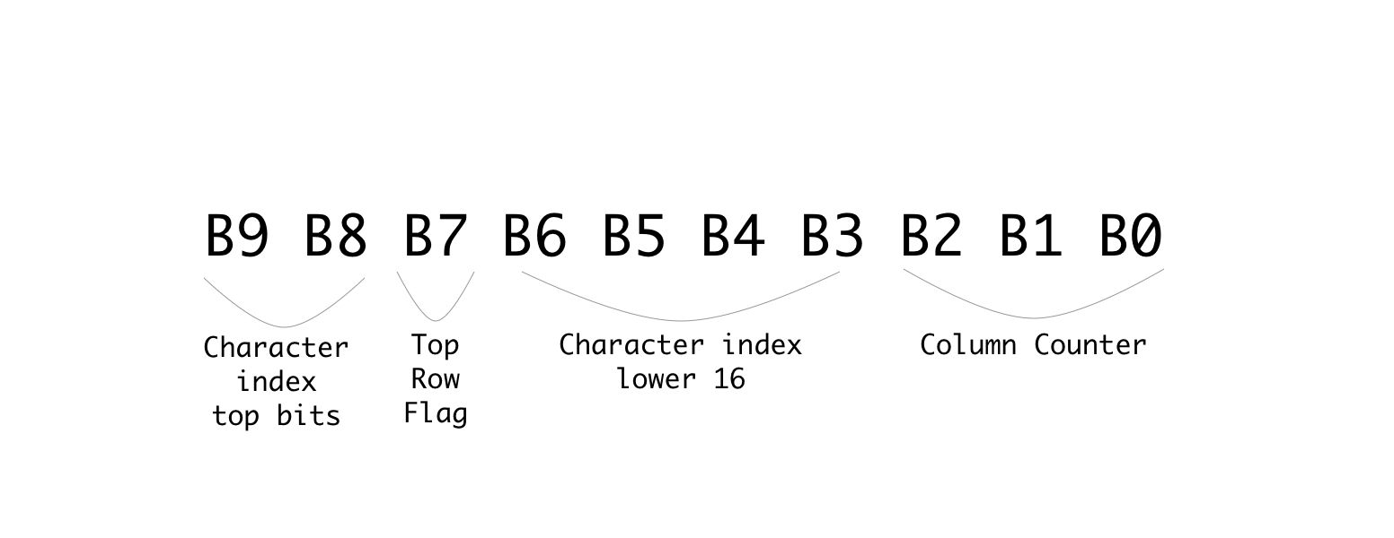 Another way to think of it is that the lower 16 bits of character index are the character number in a row and the top two bits are the row number.