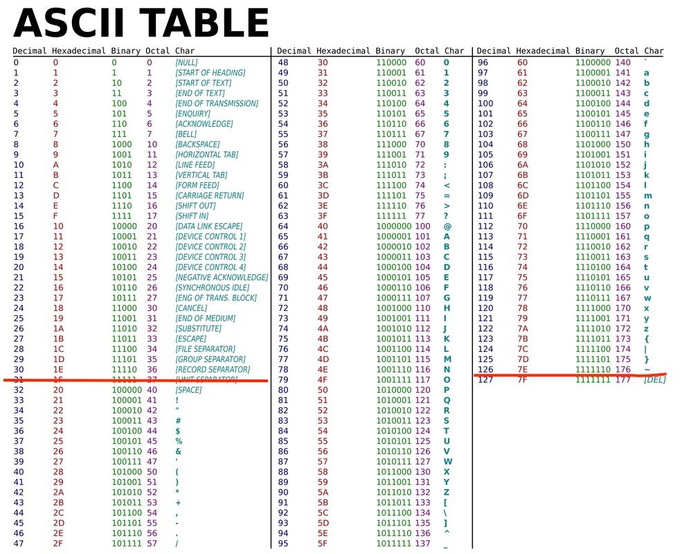 fs.writeFileSync('font.hex', memory.join(' '));We start off by loading the JSON font file and parsing it into a javascript object. We then loop over all the characters codes we want to include, which looking at an ascii table we can see that 32-126 is all the standard visible characters including space.