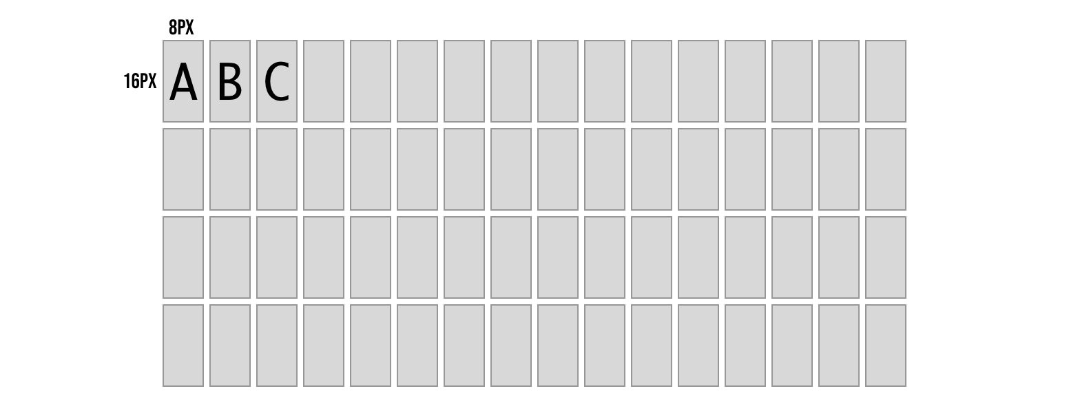 Where each number represents the value for 8 columns. The top row maps to the characters 0-15 then wraps around again to the same numbers to do the bottom row of those characters, then we continue counting the next 16.