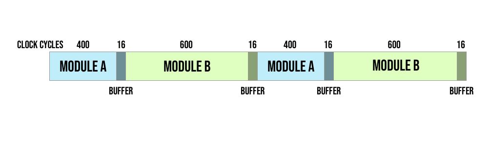 Something to look out for though is that you need to make sure the other module finished their current transaction before starting, so if it isn't exactly aligned you may need to add a buffer between modules to make sure there is no overlap. For example if a module's procedure takes 12 clock cycles, then you should have a buffer at the end of that module's turn of 11 clock cycles where they can't request but if they are in the middle of an operation they can finish.